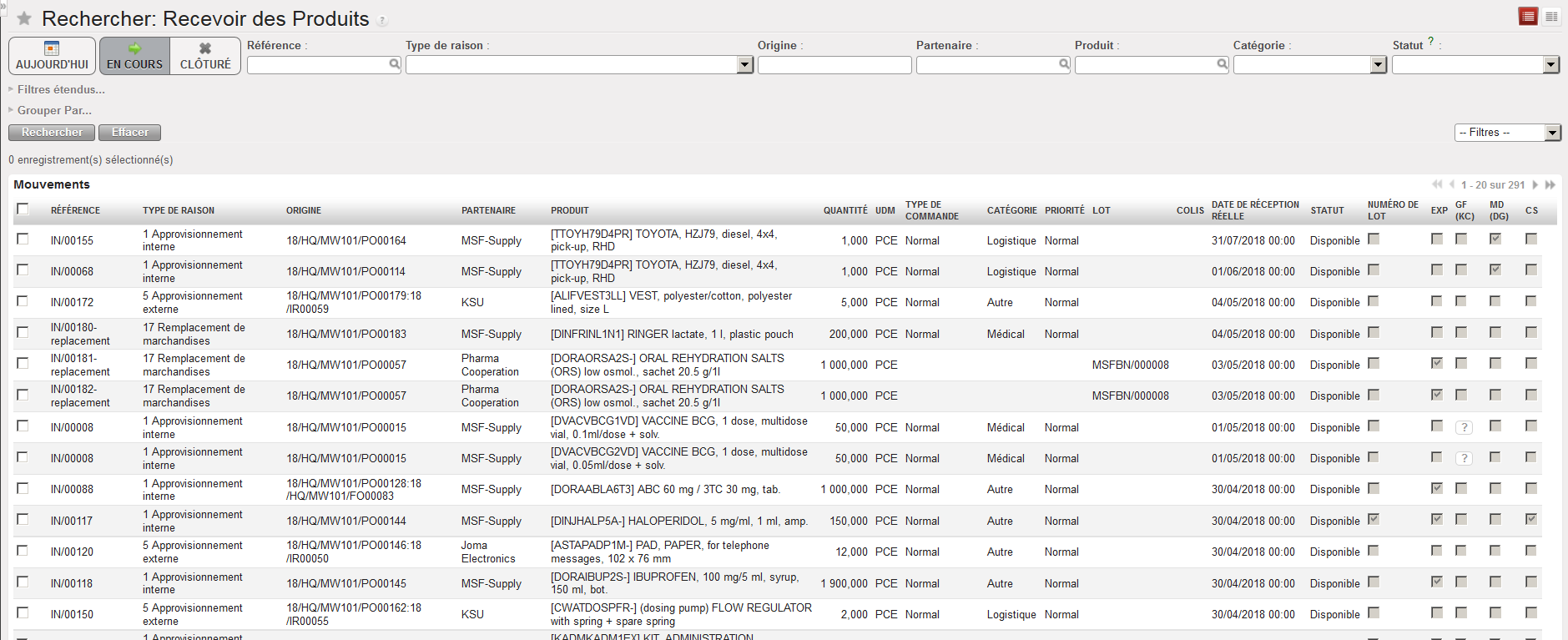 Cette fonctionnalité se concentre sur les Pickings, les Colisages et les Bons de Livraison (PICK/PACK/OUT). Elle peut être utilisée pour visualiser quels produits ont été distribués ou sont en train d’être distribués. Au moyen de filtres, l’utilisateur peut effectuer une recherche par produit, mais aussi par partenaire, ce qui peut être utile afin de visualiser ce qui a été livré ou va être livré à un projet spécifique.
