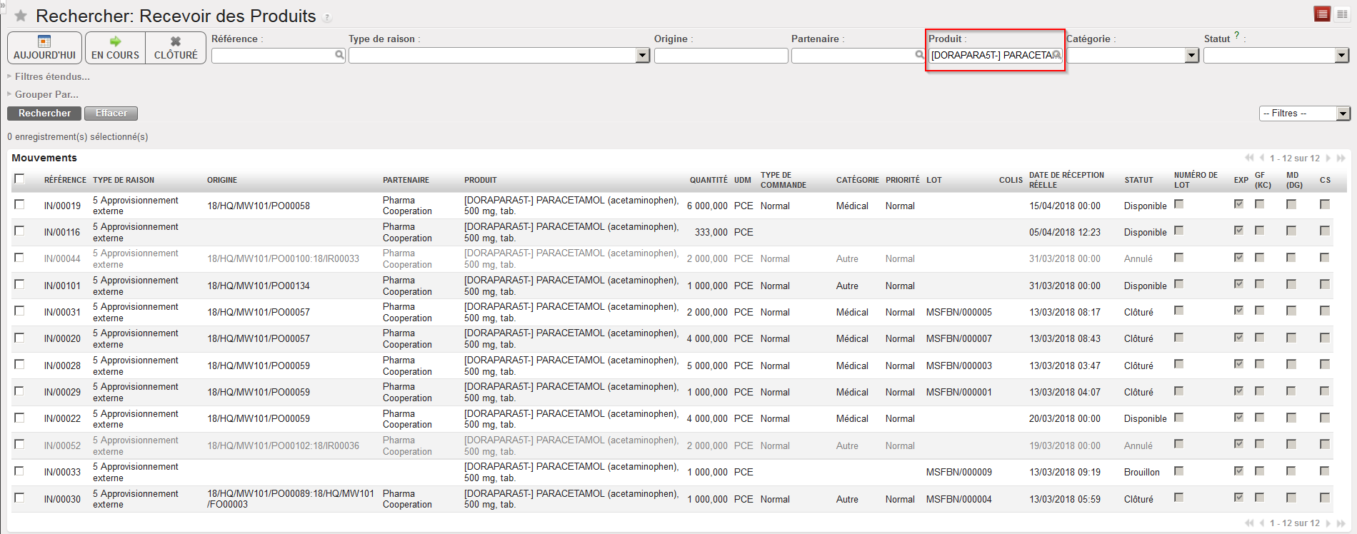 - Des filtres avancés comme le Partenaire spécifique, Produit spécifique, Liste produits, Lot spécifique ou Date d’expiration spécifique peuvent être utilisés