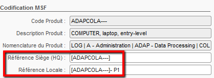 • Référence Siège et Référence Locale : en fonction du responsable de l’enregistrement initial de l’Actif, ces champs peuvent être remplis avec toute information utile au suivi de l’Actif (p. ex. le numéro ou la référence de l’Actif indiqué(e) sur l’étiquette de l’article).