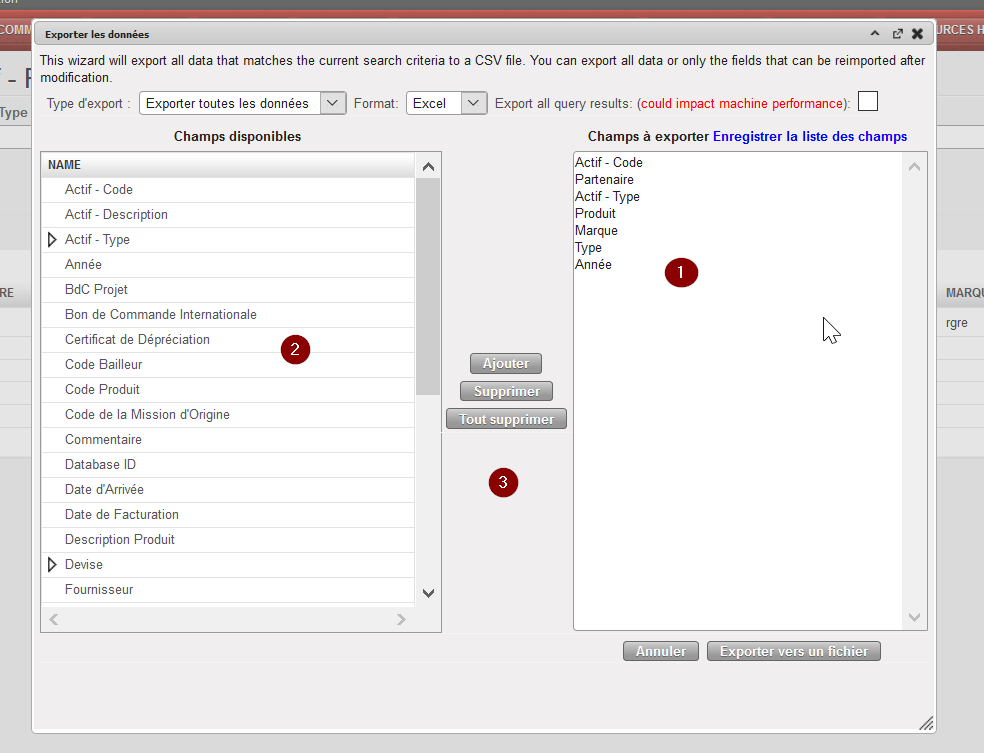 Assistant d’export de biens avec les champs par défaut à exporter