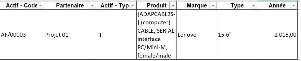 1.2 Actif – Type : généré une fois que la liste de produits est ajoutée (IT, Transport, Médical, Télécommunication ou Général) (voir étape 2).