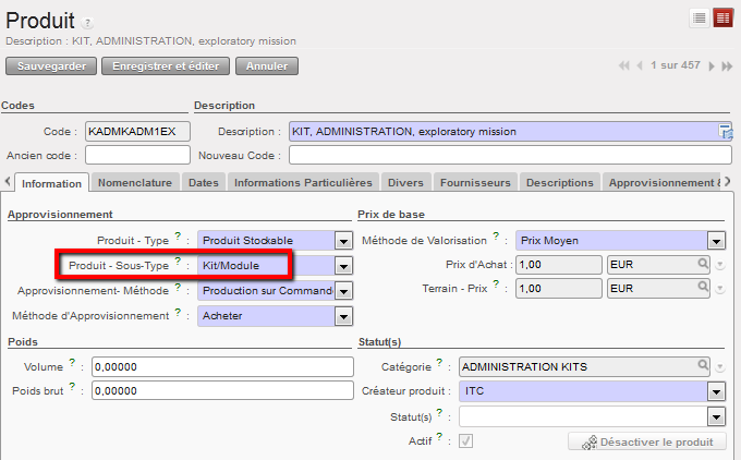 Pour qu’un produit soit considéré comme un kit dans UniField, son sous-type affiché sur la page du produit doit être « Kit/Module ».