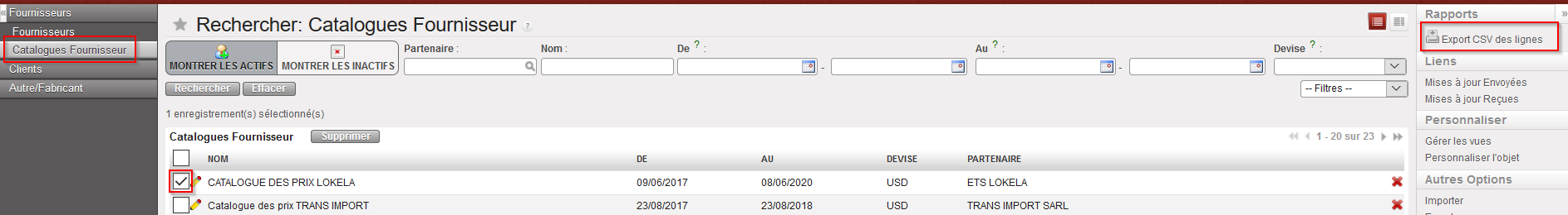 à côté du fournisseur dont vous souhaitez modifier la liste Catalogue pour ouvrir et modifier celle-ci.