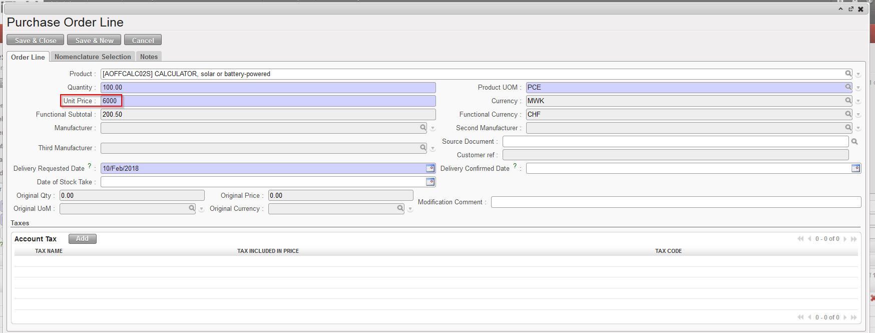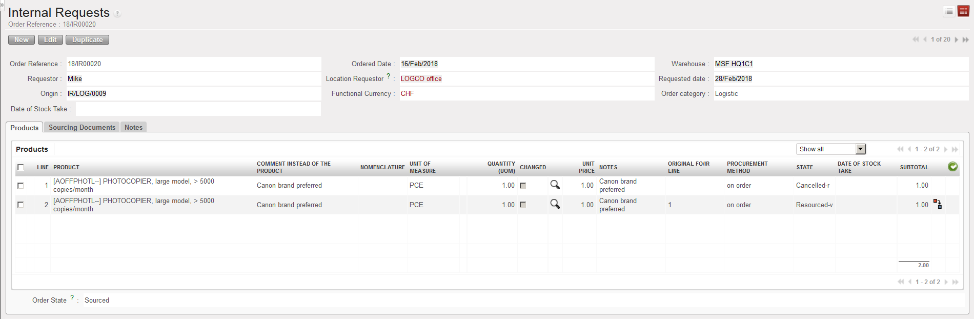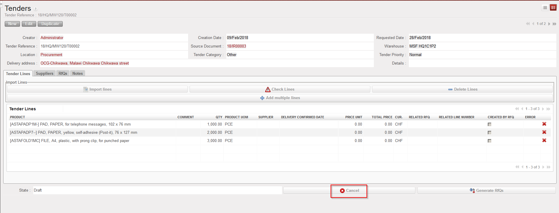 Once all Requests for Quotation have been updated with the relevant supplier quotation information and are in the state “Updated“, the user will be able to compare the different suppliers’ offers and select the appropriate supplier for each requirement (in the Tender lines).