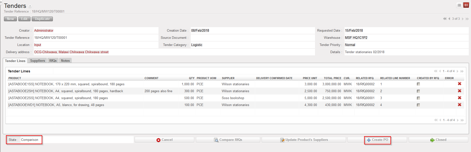To compare the different RFQ responses, go to: Purchases / Purchase Management / Tenders
