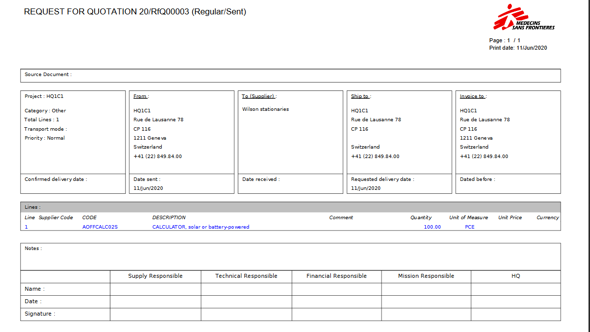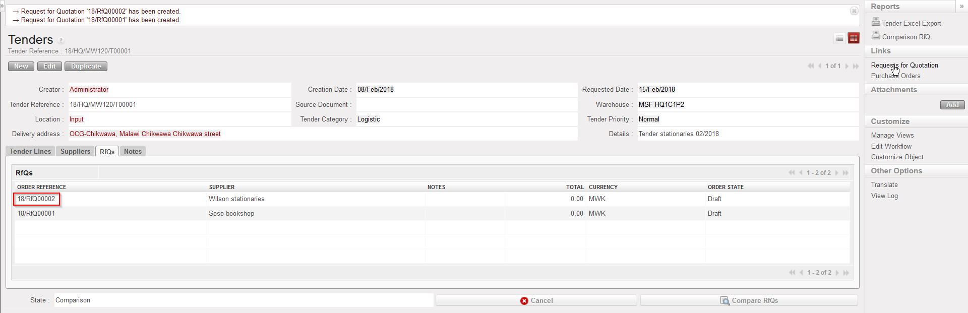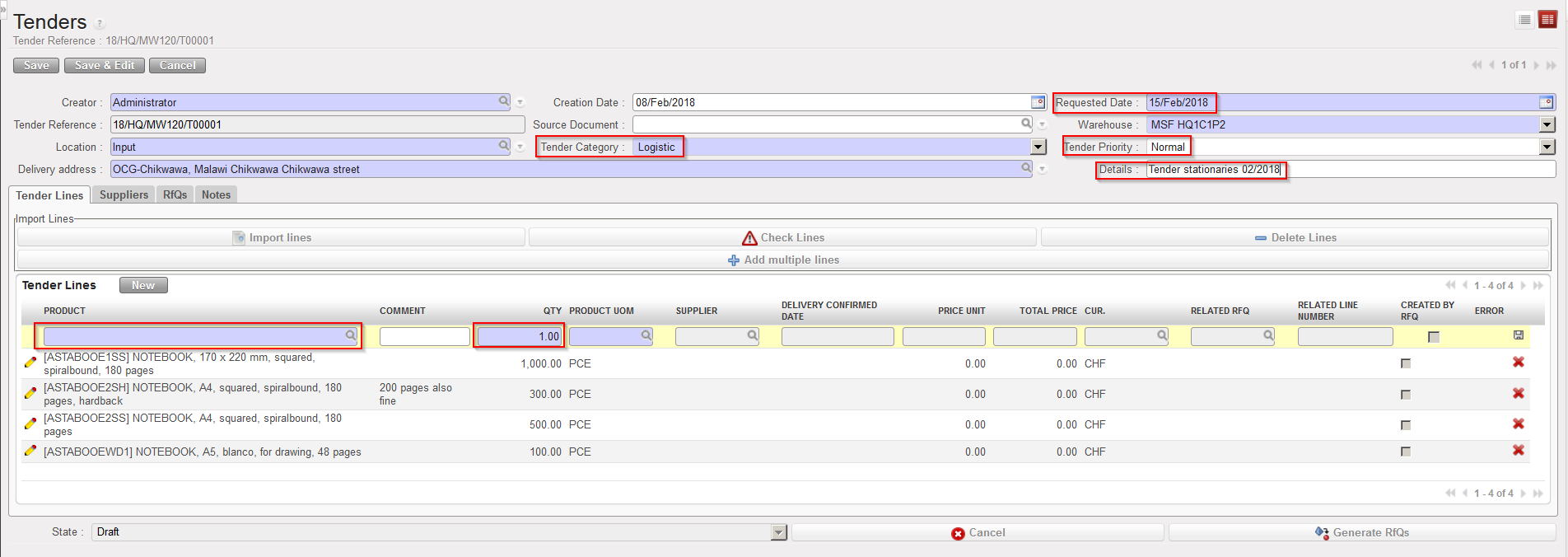 However, to make a spontaneous market analysis (e.g. a review of stationery providers in order to make supplier contracts/agreements), a Tender can be created manually from scratch. Once the Tender process is completed, a PO can be created.