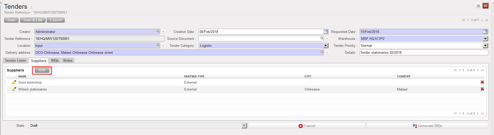 | Adding supplier to Tender |