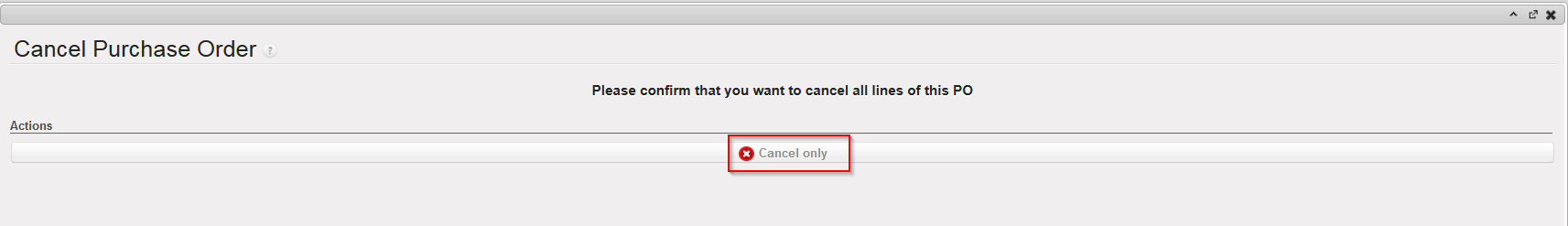 To cancel an entire PO, click on the “Cancel” button at the bottom of the PO screen and confirm via a click on “Cancelonly” on the pop-up screen. The example below is for a PO created from scratch.