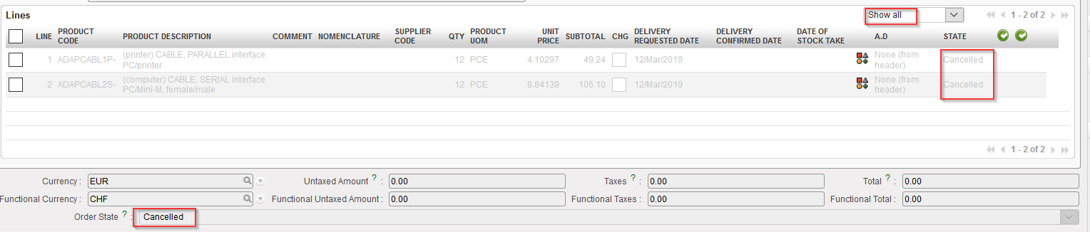 The PO switches to state “Cancelled” and all its line also switch to the state “Cancelled“. You have to use the filter located on the top of the “Linestable” to see them.