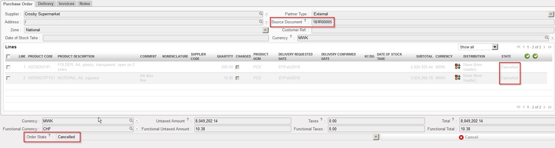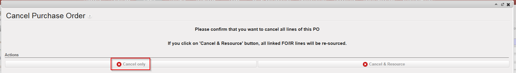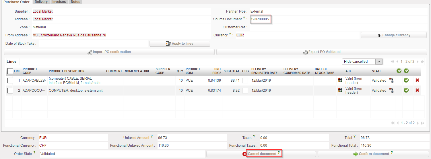 A validated PO can also be cancelled except if the PO supplier is an internal partner supplier (another instance). In this case, the cancel button won’t be available at the bottom of the PO screen and the cancellation should be done on the supplier instance.