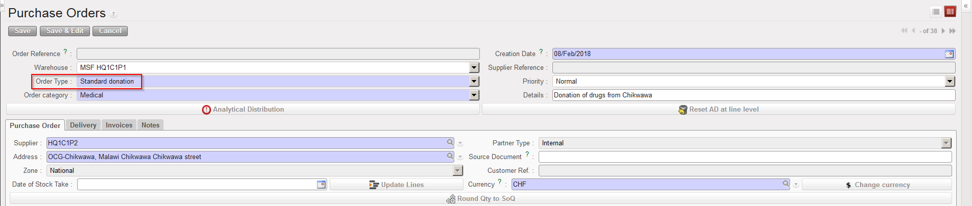 There will be times when there is need for different types of Purchase Orders, to facilitate receiving donations, loans or to request a supplier to send the goods directly to another instance.