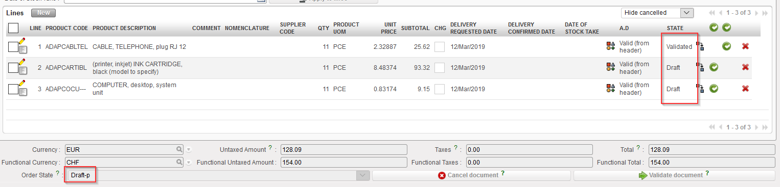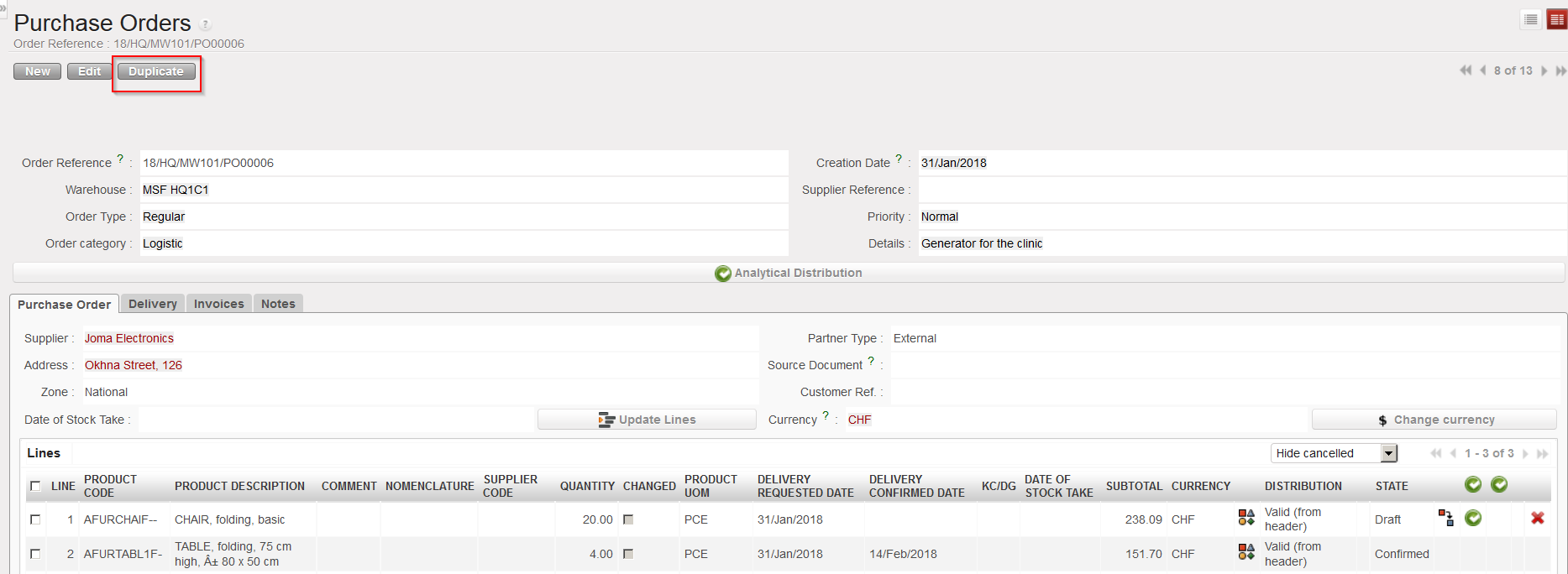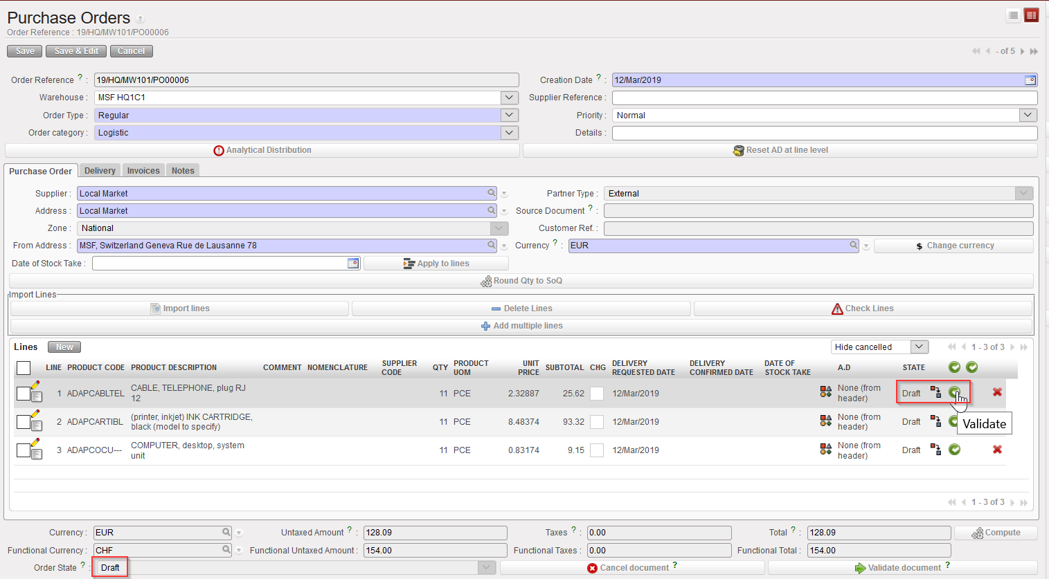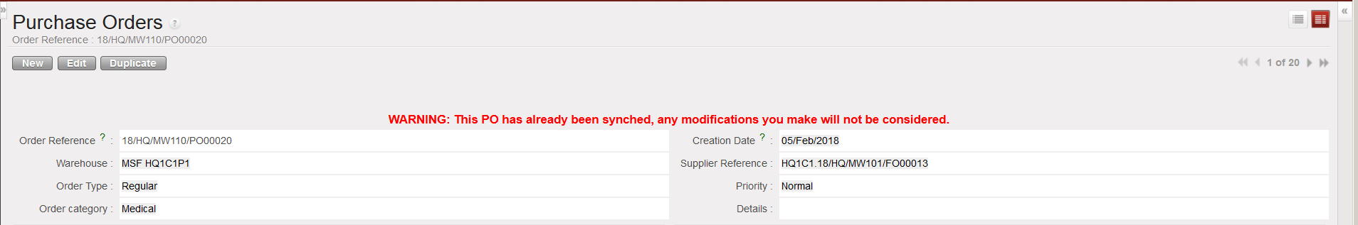 A Purchase Order may need to be updated, if the products, quantities, prices, supplier or any other information has changed after the PO has been created. Please note, if a PO-line has been validated and then synchronized to a supplier instance, it should not be changed after this at the point of origin. Similarly, once a PO-line has been confirmed by the supplier, any change on products, quantity, price,… should be made at the point of reception, not on a confirmed PO-line.
