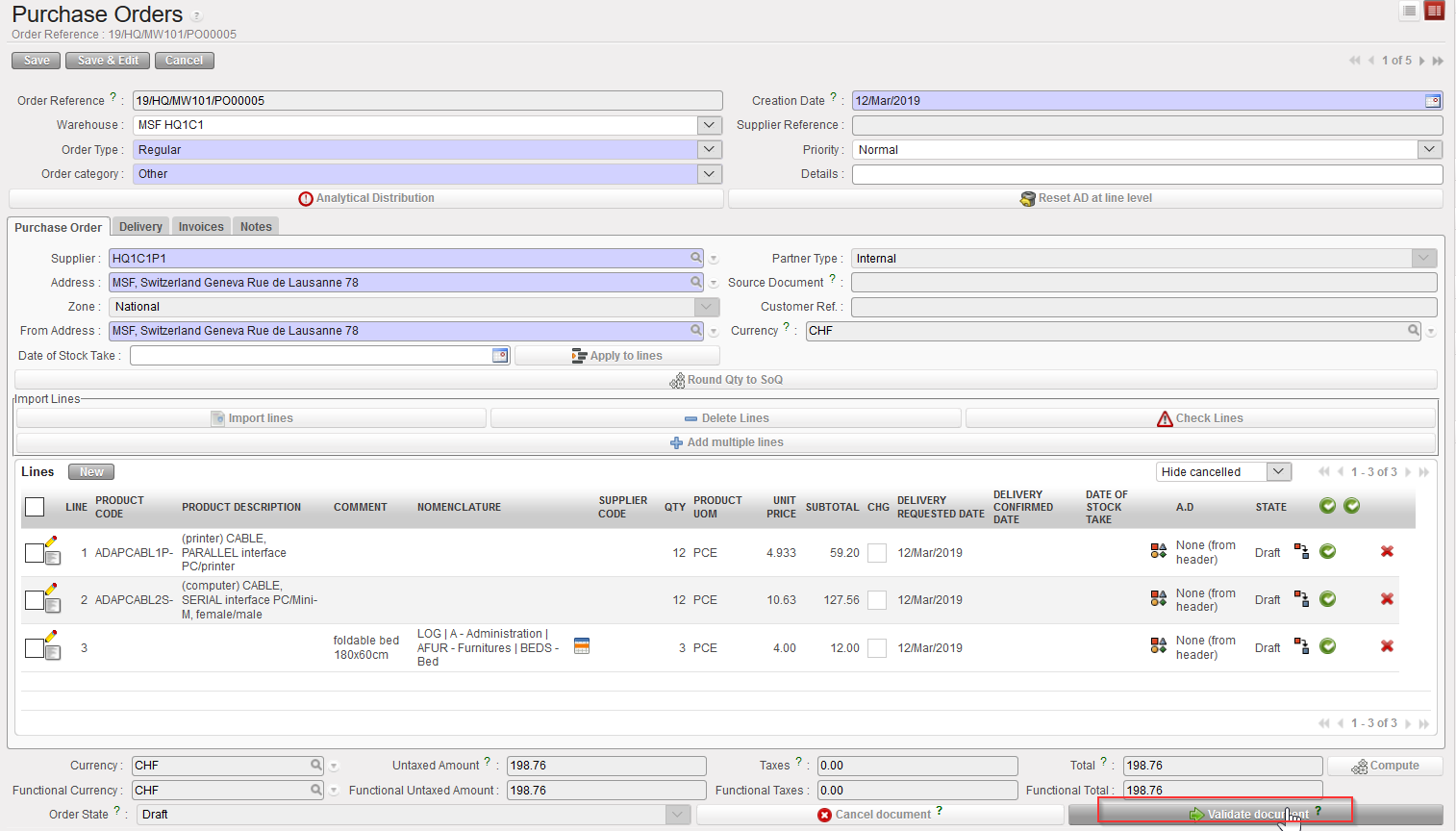 - Adding a new line (only for “Draft” or “Validated” PO): addition of a new line to a sourced PO will require to fill the “Source document” field at line level with a non-Confirmed, non-Closed nor Cancelled IR/FO (of regular Order Type). If the Source document reference is different from the one existing at PO header, then the new reference will be added as well a the “Source document” header level.