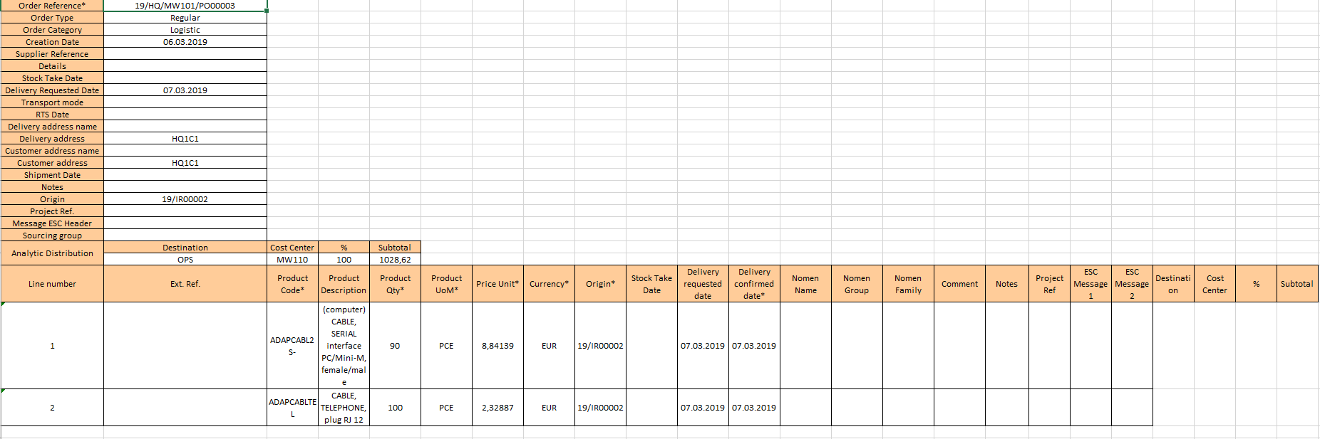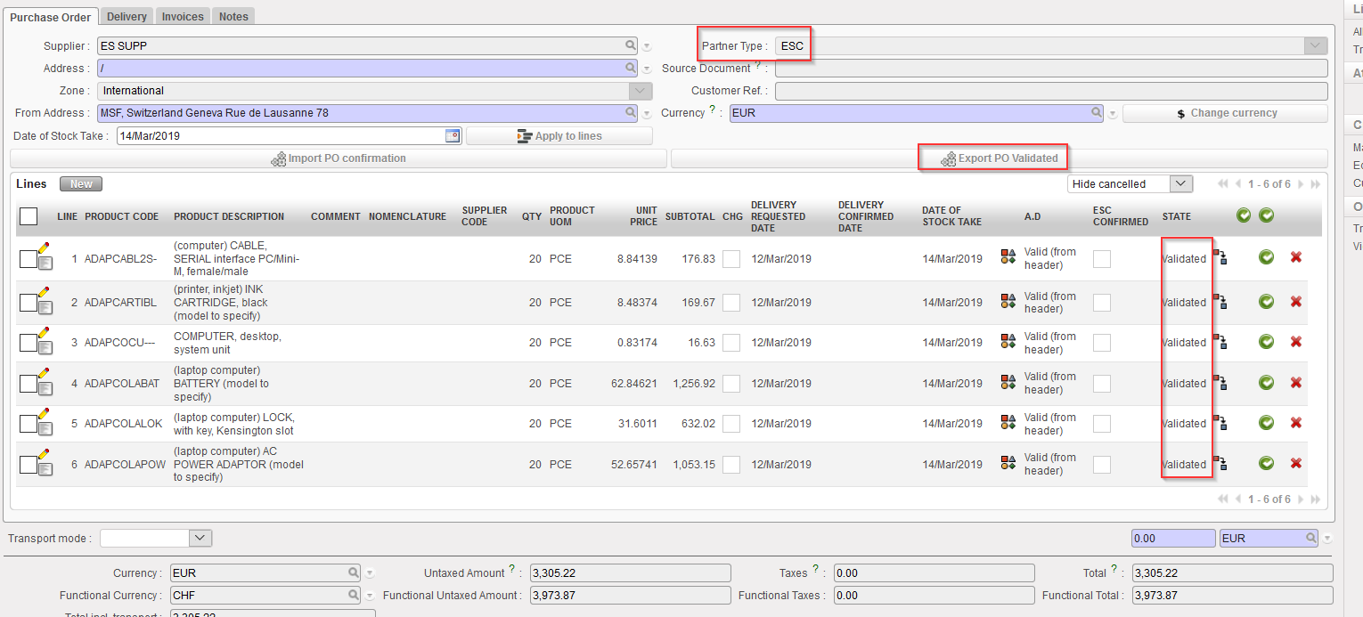 You will often update manually Purchase Orders addressed to external partners (or ESC). After validation, the PO will be sent to the supplier. The supplier should then send you his order confirmation which should include correct prices, correct product codes, correct quantities, confirmed delivery date,… The PO should then be updated with this information before confirmation in the system.