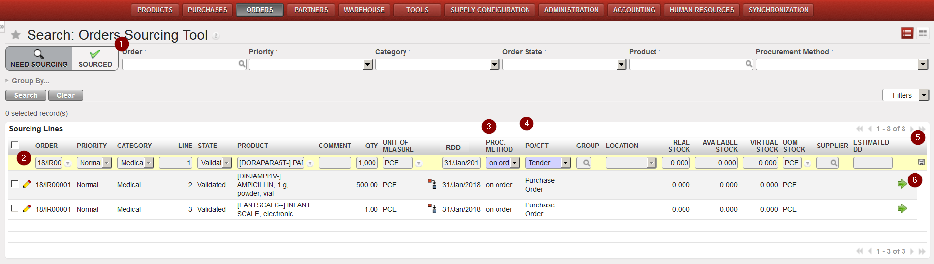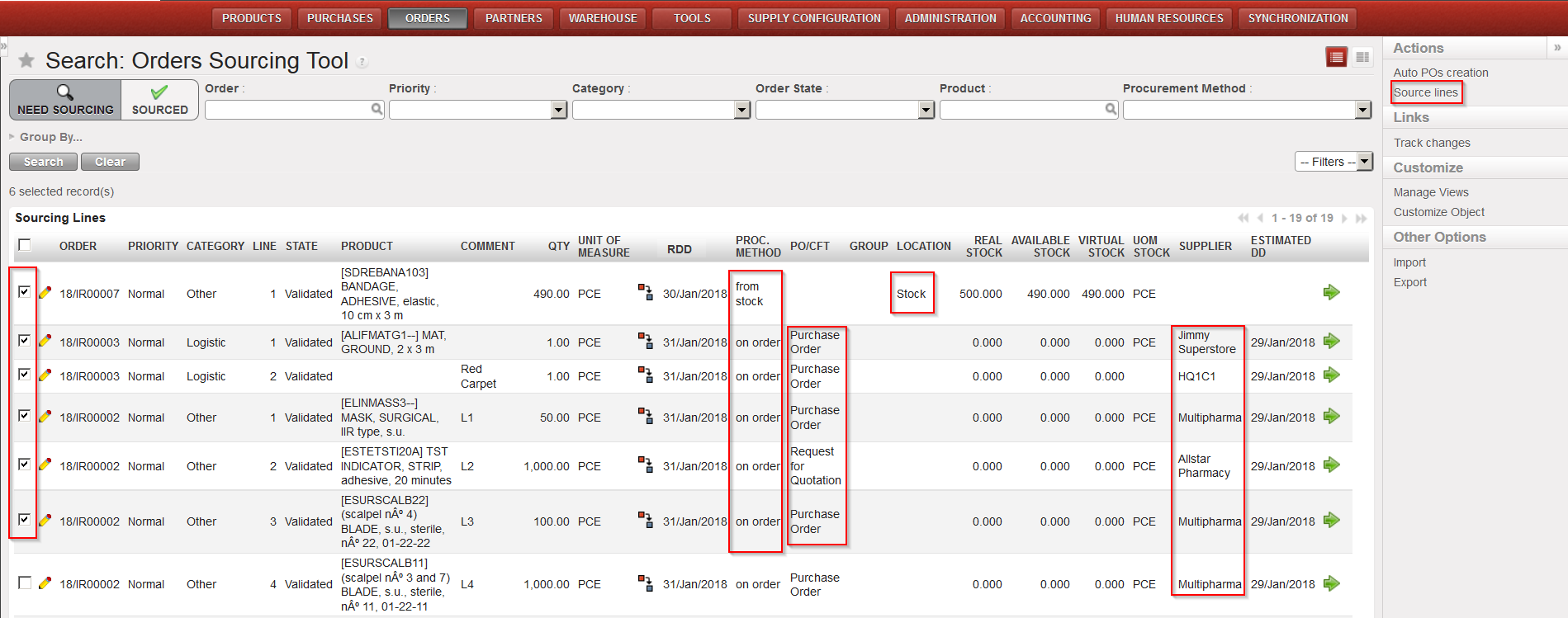 - “Add multiple lines” button: click “Add” on the pop-up screen and search for the products you want to add from the “Search Products” screen. Use the relevant filters: Nomenclature, Description, Code, Lists, Catalogues,… Select the products you need by ticking the boxes at the left of the corresponding products lines and click on “Select” to add them in the list of products you want to include in your FO. Once you have all the products you need click on “Add products“. Note that quantities can already be entered on the “Add multiple products” pop-up screen.