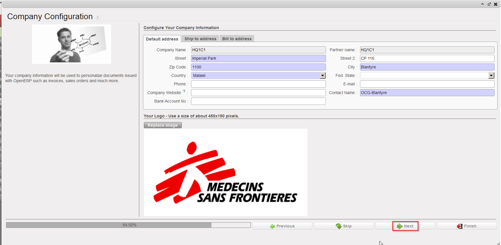 The company matches with your instance and with the internal partner bearing the name of your instance. This step allows defining a default address, a delivery address and an invoicing address for your instance. These addresses are automatically copied on the internal partner bearing the name of your instance.