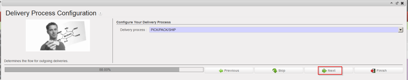 This step enables to choose what sort of delivery process is appropriate for the instance. It may be that the “Simple Out” process (meaning the simple delivery process) is sufficient, or the more complex process which was developed for UniField (pick/pack/ship) may be more appropriate. Delivery workflows can be changed according to the need and context.