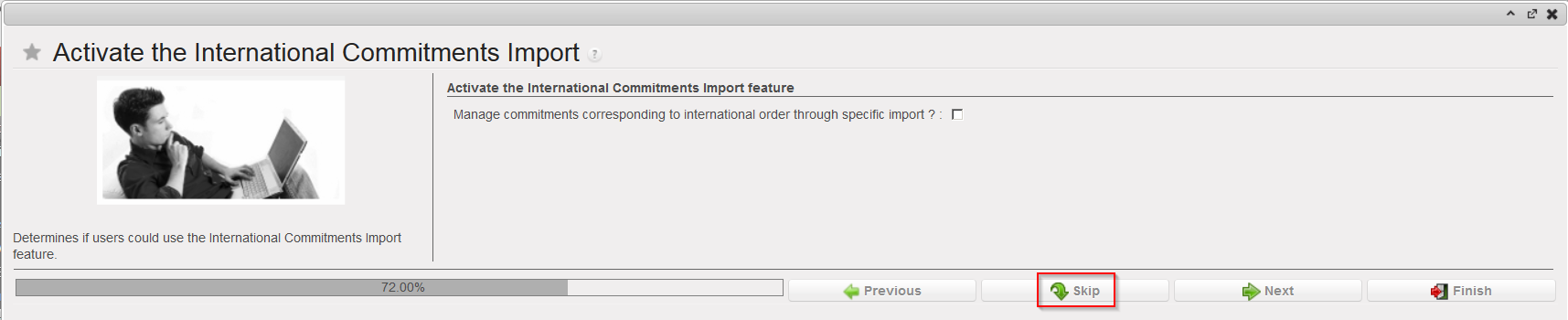 - The first step “Activate the International Commitments Import” is to be completed by finance. Select “Skip” to skip this step and continue the configuration.