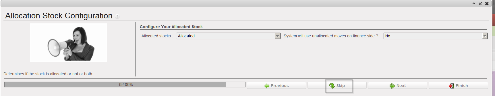 The field “System will use unallocated moves on finance side” is not relevant since all stock will be allocated for the time being.