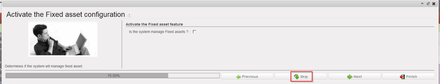 2. In the second step, you see a window asking you to activate the fixed asset. This step is to be completed by finance. Select “Skip” to skip this step and continue the configuration.