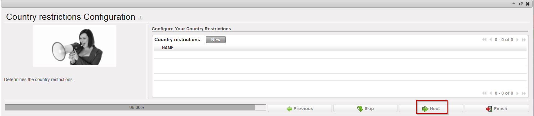 Most of the configuration windows have the same format. They include a progress bar on the bottom left (percentage completed) and progress buttons on the bottom right.