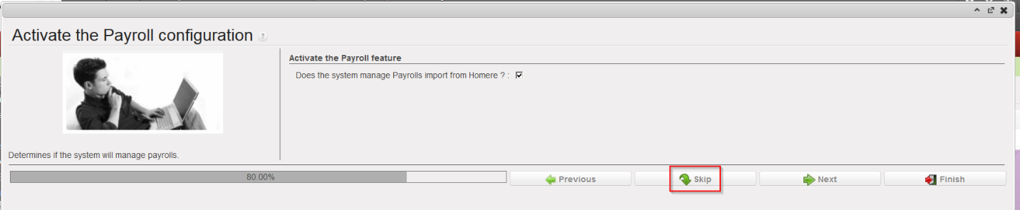 3. Activate the Payroll configuration, to be completed by finance. Select “Skip” to skip this step and continue the configuration.
