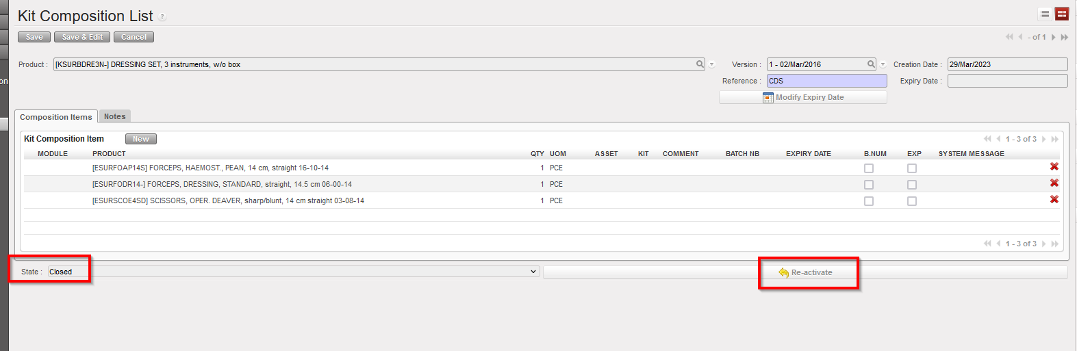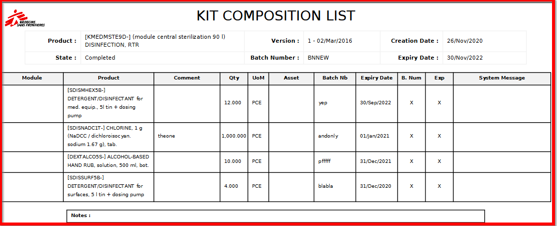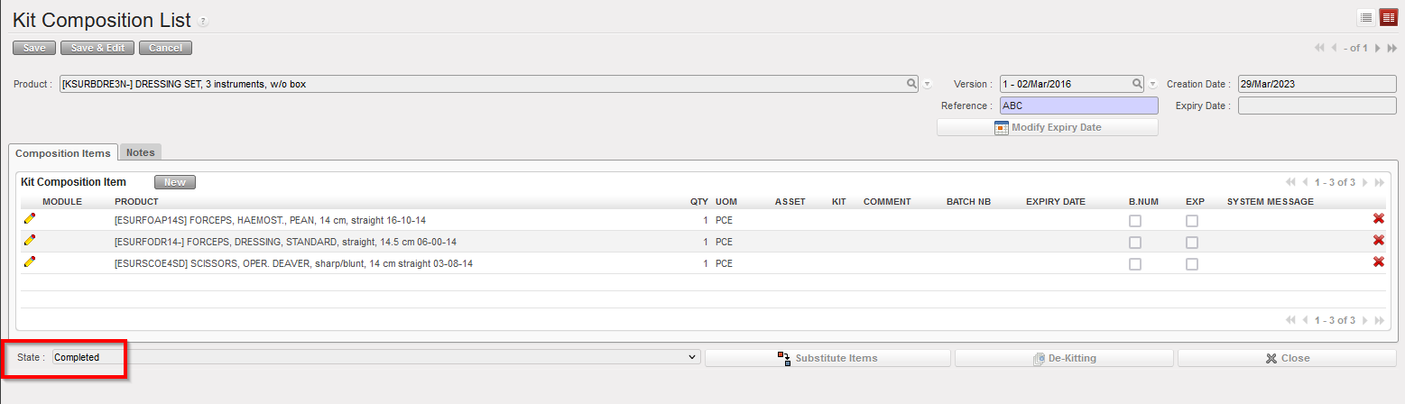 NB: If any component in a kit need to be managed by Batch Number/Expiry Date, these fields will be mandatory in the KCL for the kit.