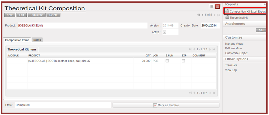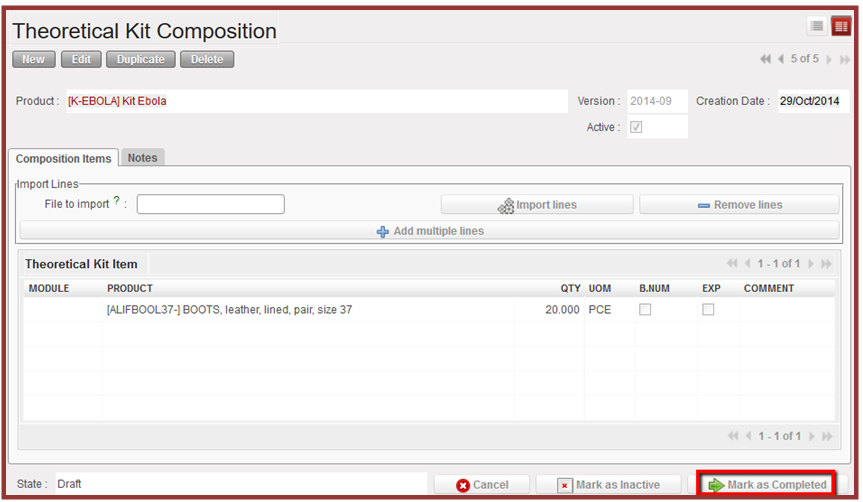 7. When your Theoretical Kit Composition has been completed, Click on the “Mark as Completed” button, and will pass from Draft to Completed status.