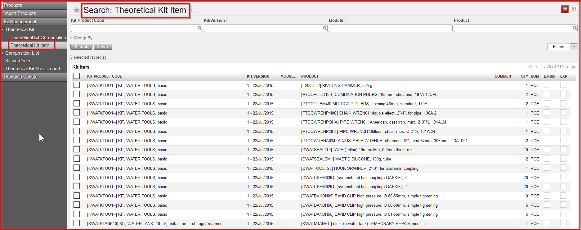 Also if you need to check which items are associated to a TKL, Go to: Products/ Kit Management / Theoretical Kit / Theoretical Kit Item