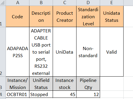 This report is generated in excel at HQ level and shows every product which has the Status set as “Stopped”, the header information of the product is displayed (code, description, product creator, Unidata status), and below this it lists each instance where the product is present in stock or is in the order pipeline. OC guidelines should be consulted before taking any further action.