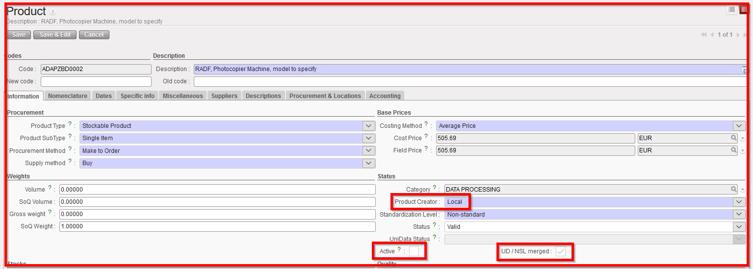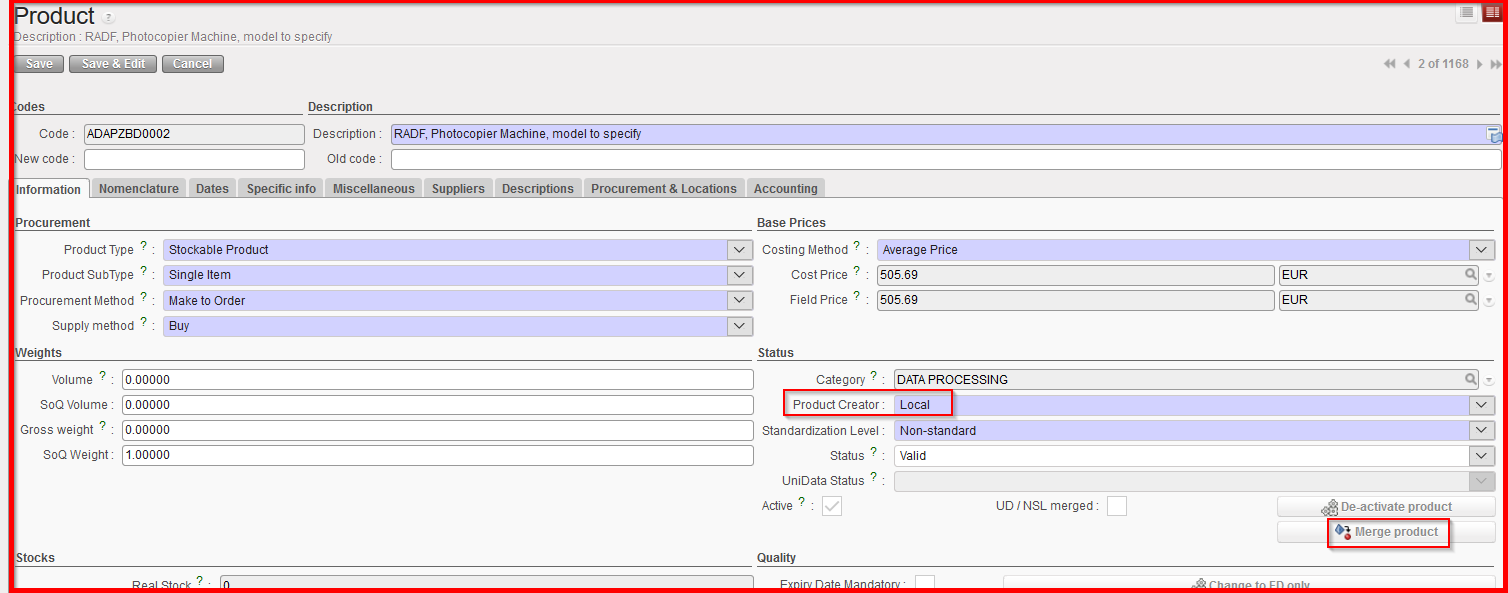 The merge is intended to be done on a one to one basis and only from Coordination instance. Therefore, the button “Merge product” will be found on the local UF product only and can only be merged to one UD product. It will be a one shot action meaning that once merged the local product cannot be un-merged and will be deactivated for good (its only reference will remain in the “old code” field from the related UD merged product and obviously in the “Track changes”) while the new merged UD product will be active.