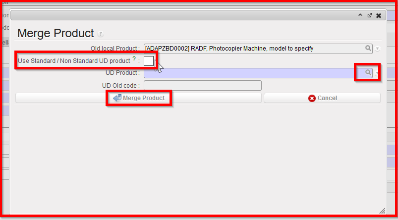 4. From the wizard, select the UD product to be merged by clicking the magnifier from the “UD product” field