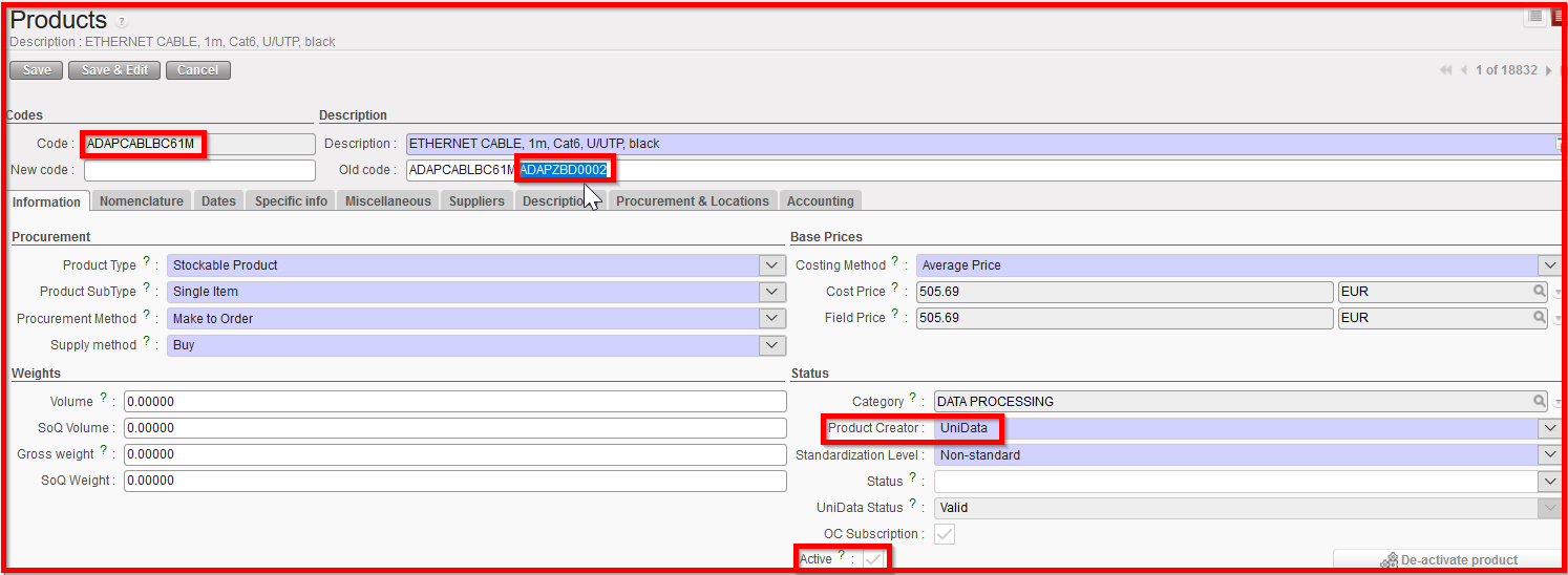 The new UD merged product has now replaced this UF local product an all existing open or closed document and has the UF local product referenced in the “Old code” field:
