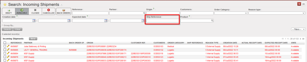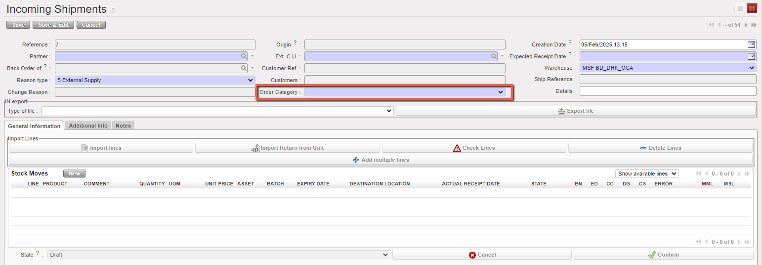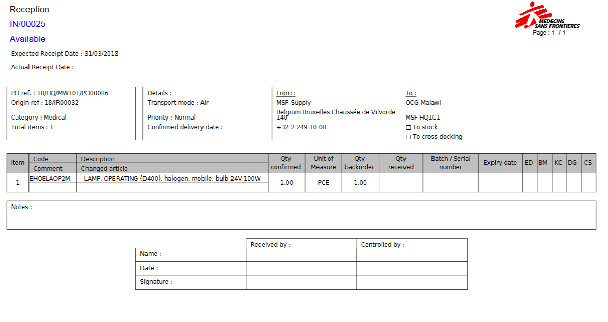 An Incoming Shipment can also be associated to a Delivery Order (OUT created automatically but always processed manually) which is another type of movement. The source location will be “Cross docking” while the destination location will be the final destination of the goods (ECU, “MSF Customer”, “Other Customer”).
