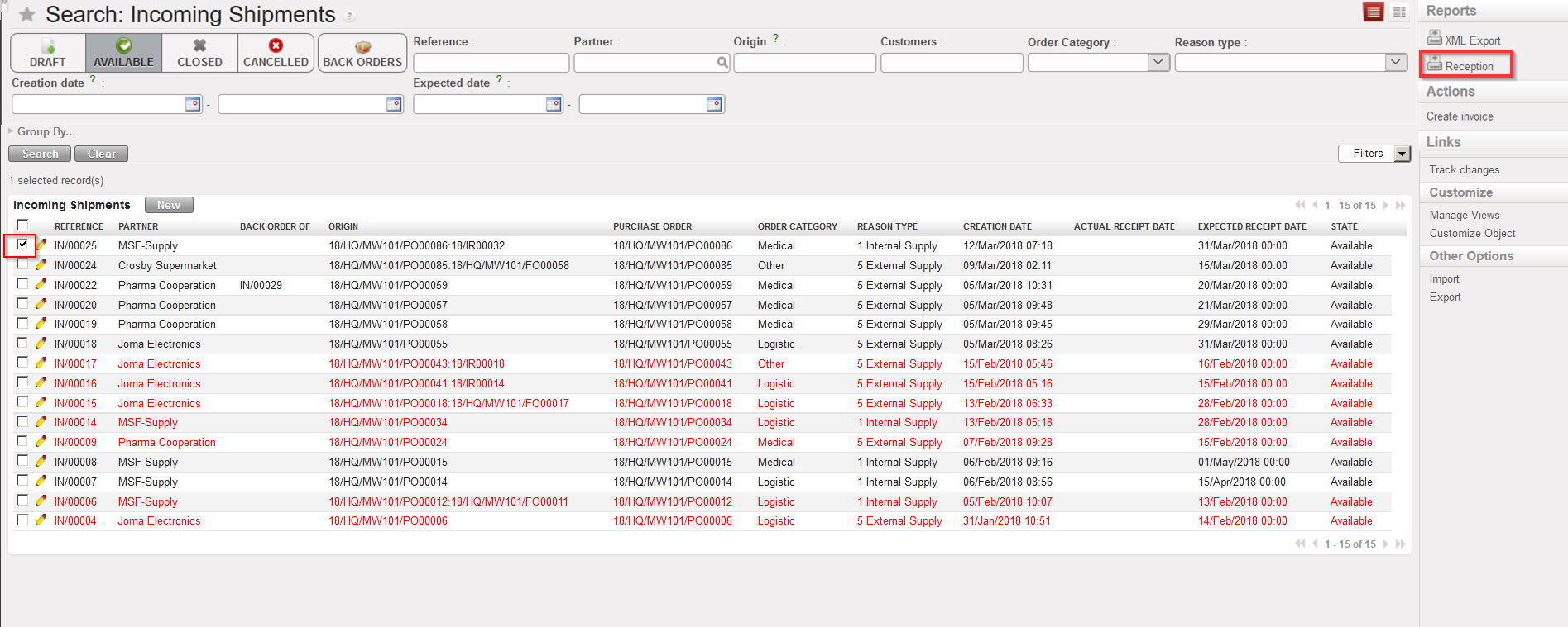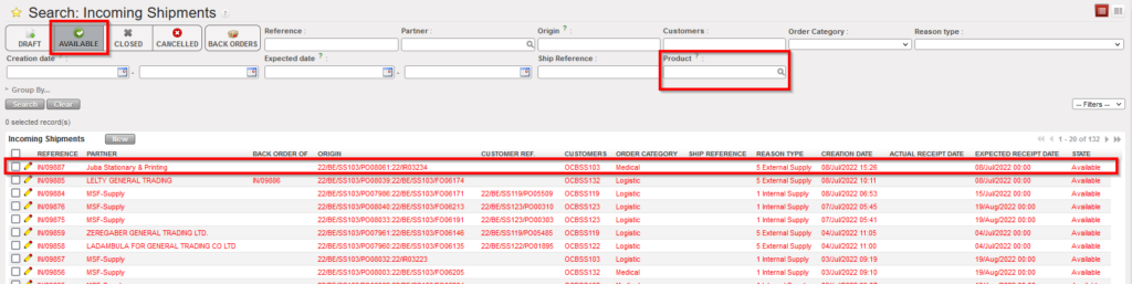 2. Click on the line corresponding to the Incoming Shipment (in “Available” state) that you wish to receive.