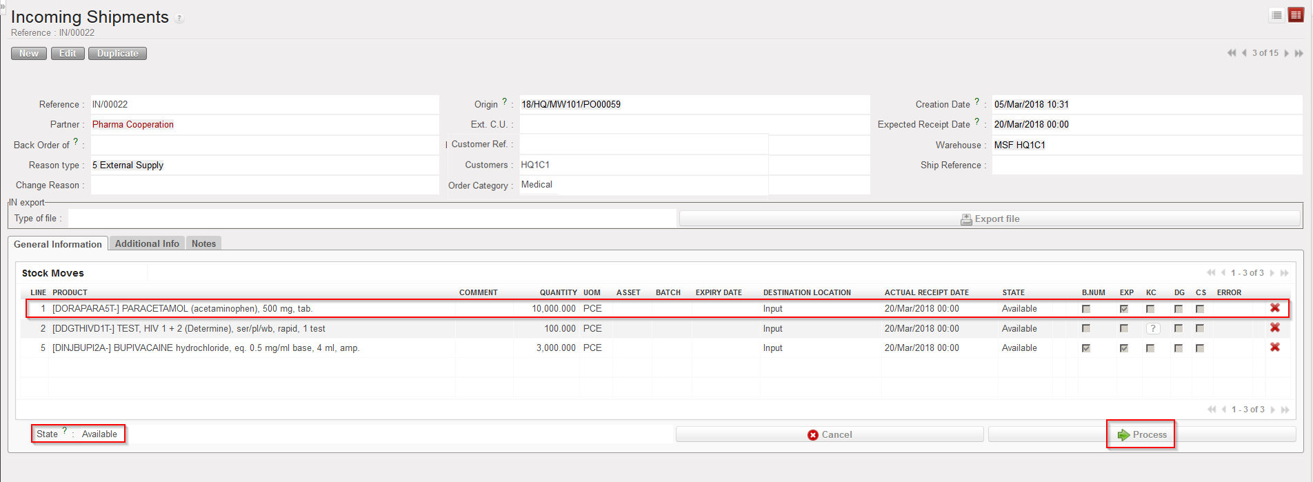 On each line of the IN, you can see the product code and description, the quantity, the UoM, the destination location, the state (which should be “Available” until processed). Some checkboxes indicating if the product is managed by batch numbers, by expiry dates, should be kept cool (KC), is a dangerous goods (DG) or is a controlled substance (CS) are also available. The “Error” column indicates if the product has been deactivated (the checkbox should be blank in order to process the product).