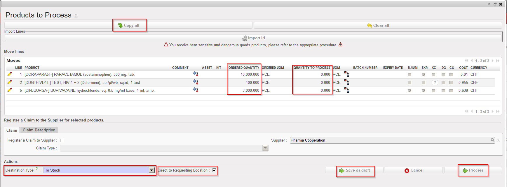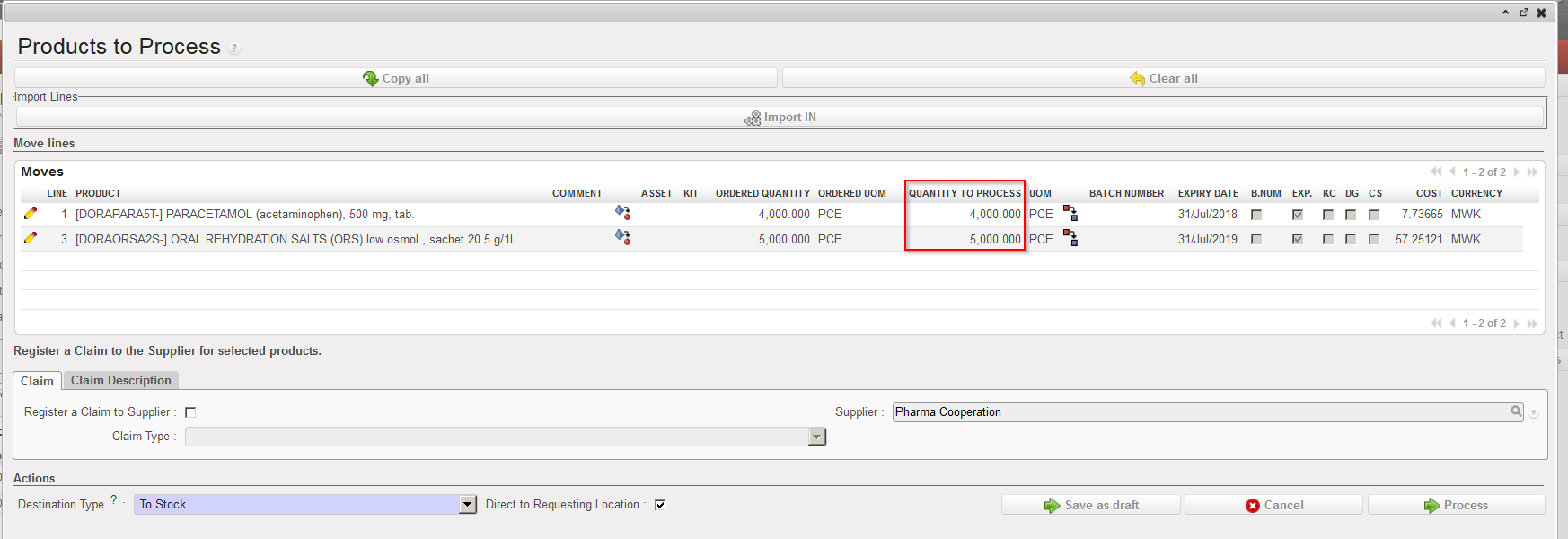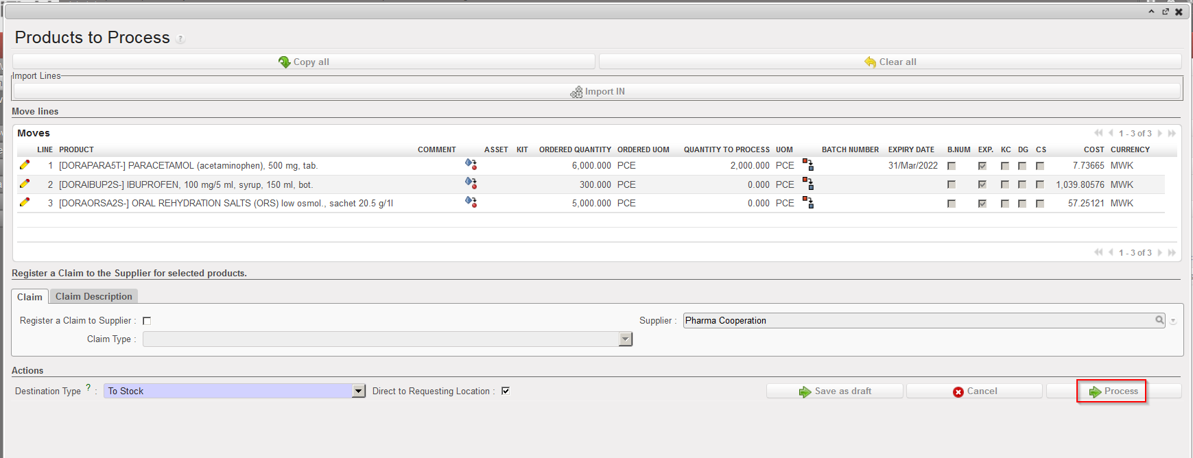 4. Once all product lines currently being received have been updated, click on the “Process” button at the bottom of the screen to register the reception. Since the “Direct to Requesting Location” checkbox is ticked by default, the products will be moved directly to their final destination. However products received for external customers will be received in the “Cross docking” location.
