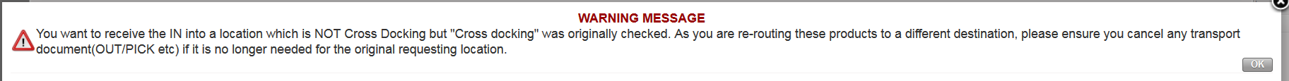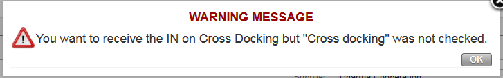 Warning given by the system if you try to receive goods in stock while cross docking was planned
