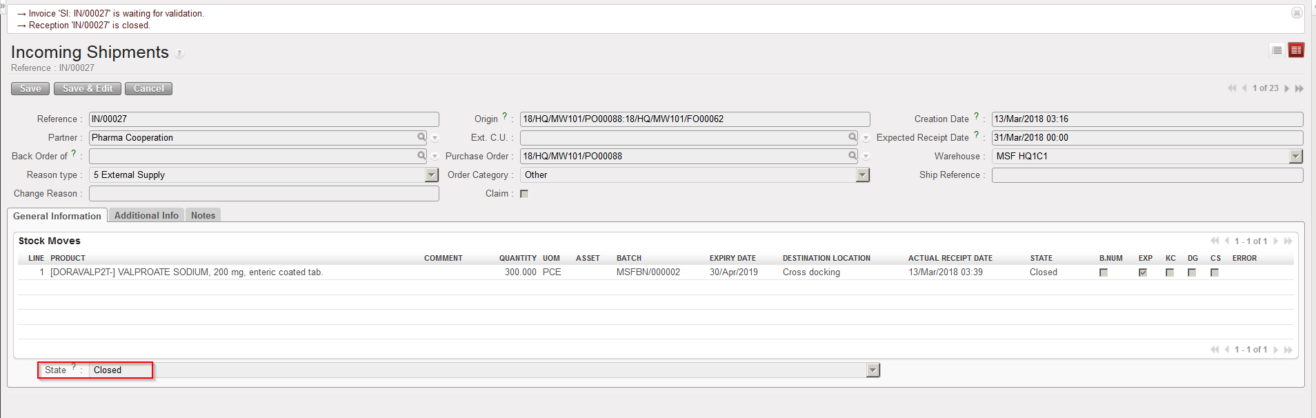 As we will see later, if an Incoming Shipment is only partially processed (i.e. partially received, with some items in back order), a new IN will be created in state “Closed” to register the received products while the current IN will be updated and will stay open (“Available“) to receive the back order in the future.