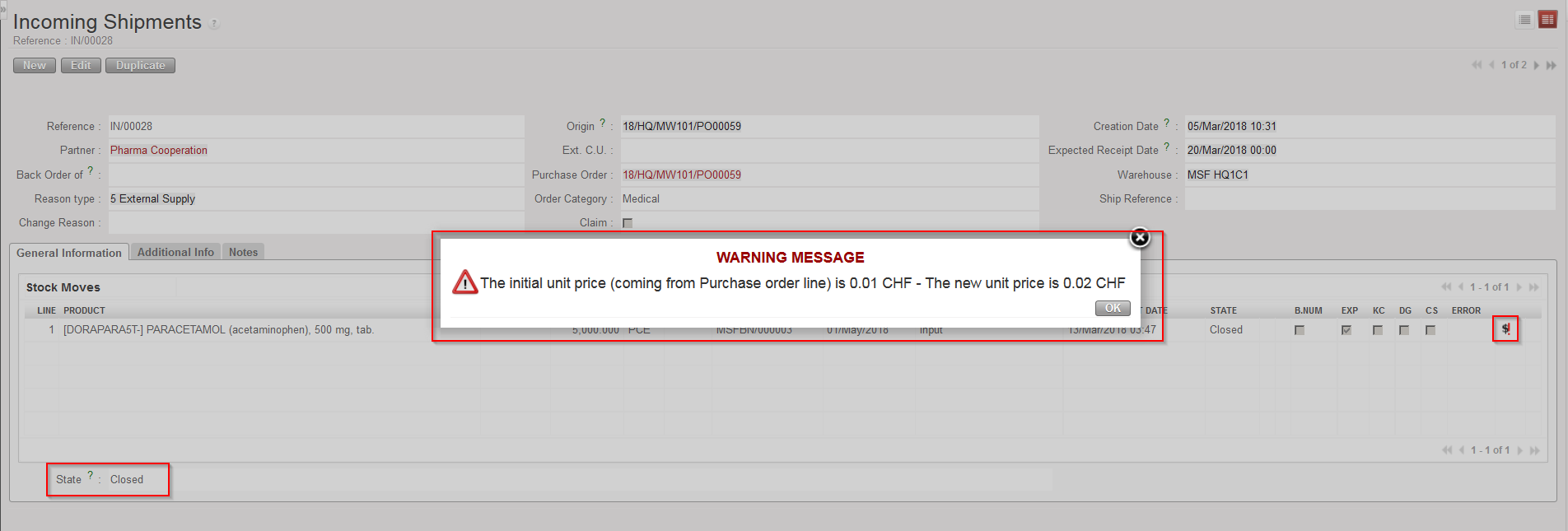 In case the product price is changed when processing the IN, a icon will be displayed on the “Closed” IN and the details of the change will be visible if you click on the icon.
