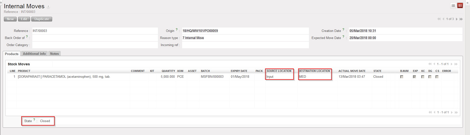 If the “Direct to Requesting Location” checkbox was unticked, goods are now stored in a transitional location called “Input“. They should be moved manually to their final destination (after quality check) via the processing of an Internal Move (created by the system) from “Input” to this final destination.