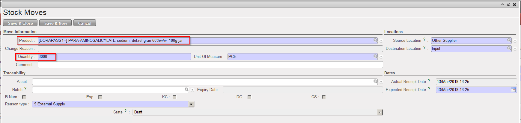 8. Enter product and quantity on the “Stock Moves” screen. The system warns you if the product is managed by batch number and/or expiry date.