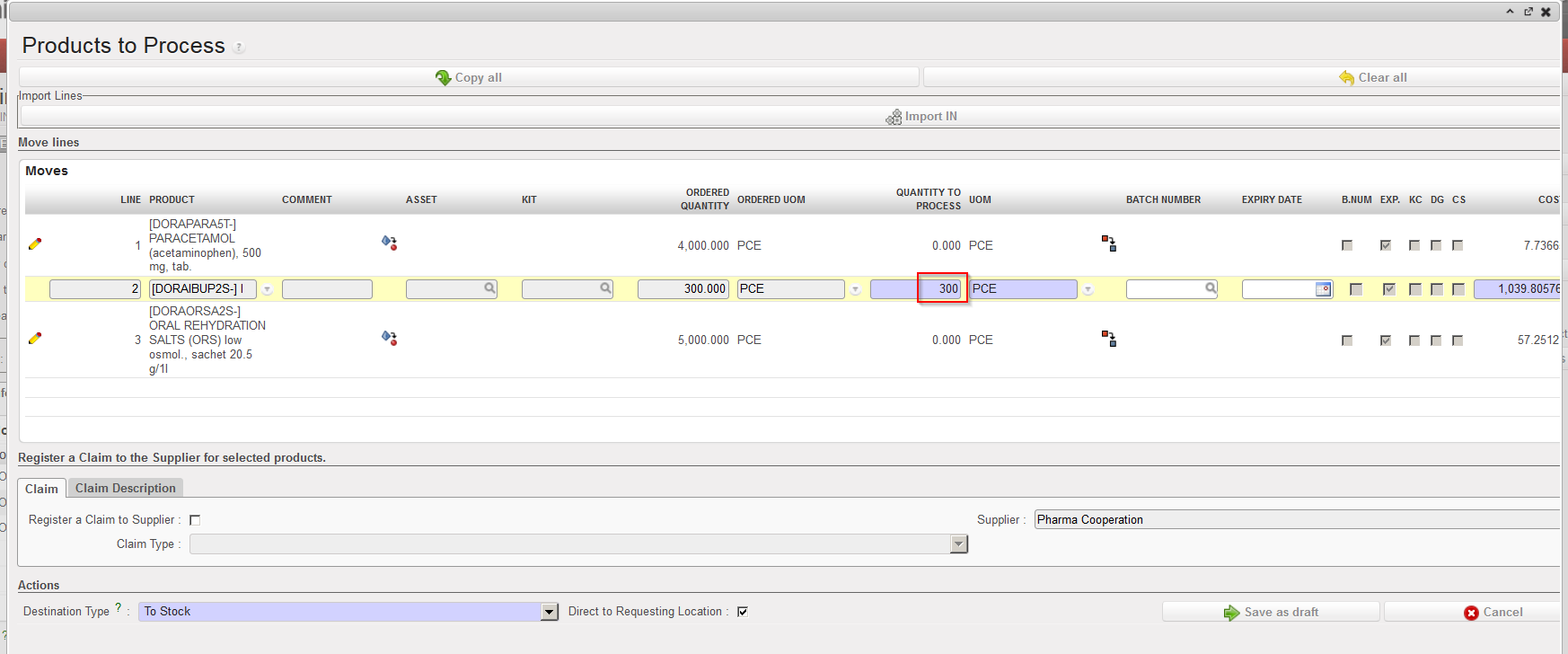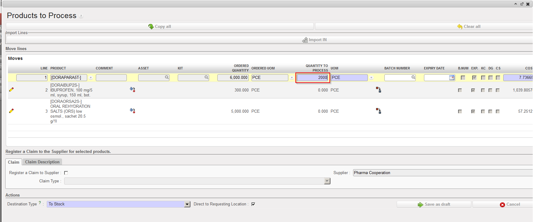 If you received only partly what is on the “Available” IN, click on the pencil for each line that you are receiving, enter the received quantity in the “Quantity to process” field and save the line by clicking on the floppy disk icon on its far right (sometimes hidden!) or by pressing “Enter” on your keyboard. Repeat the operation for each received item.