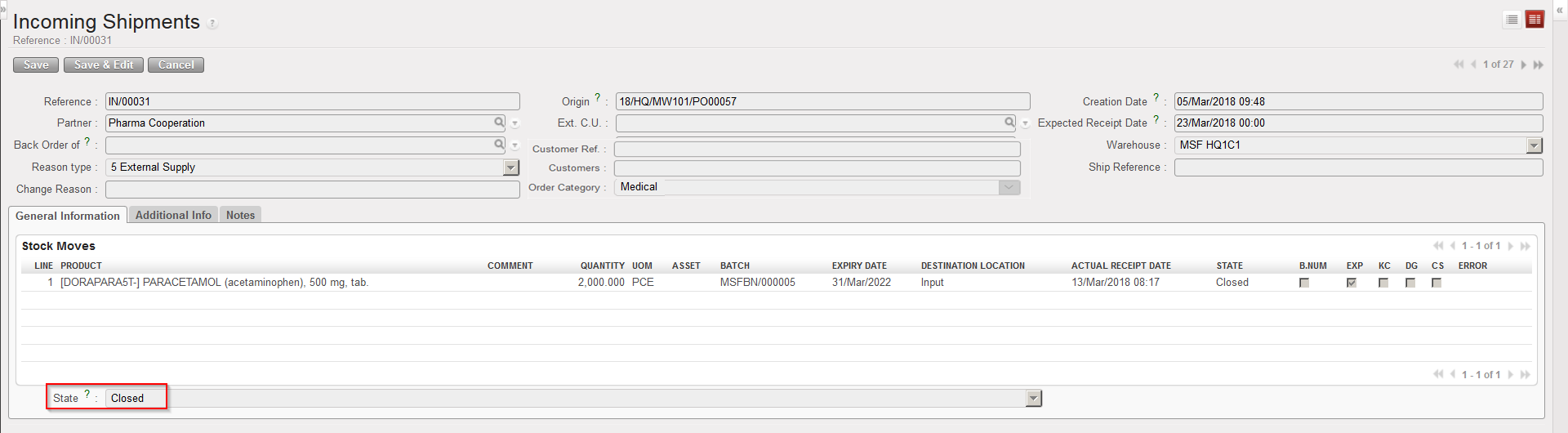 We will also see later that if products managed by batch numbers (BN) and/or expiry date (ED) are received, the user will have to encode the BN/ED details at this stage (i.e. when processing the IN).