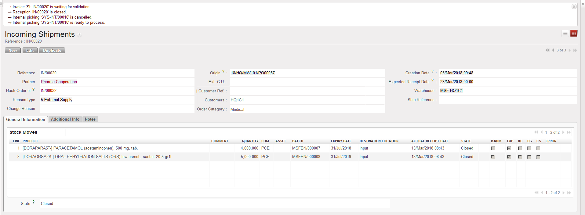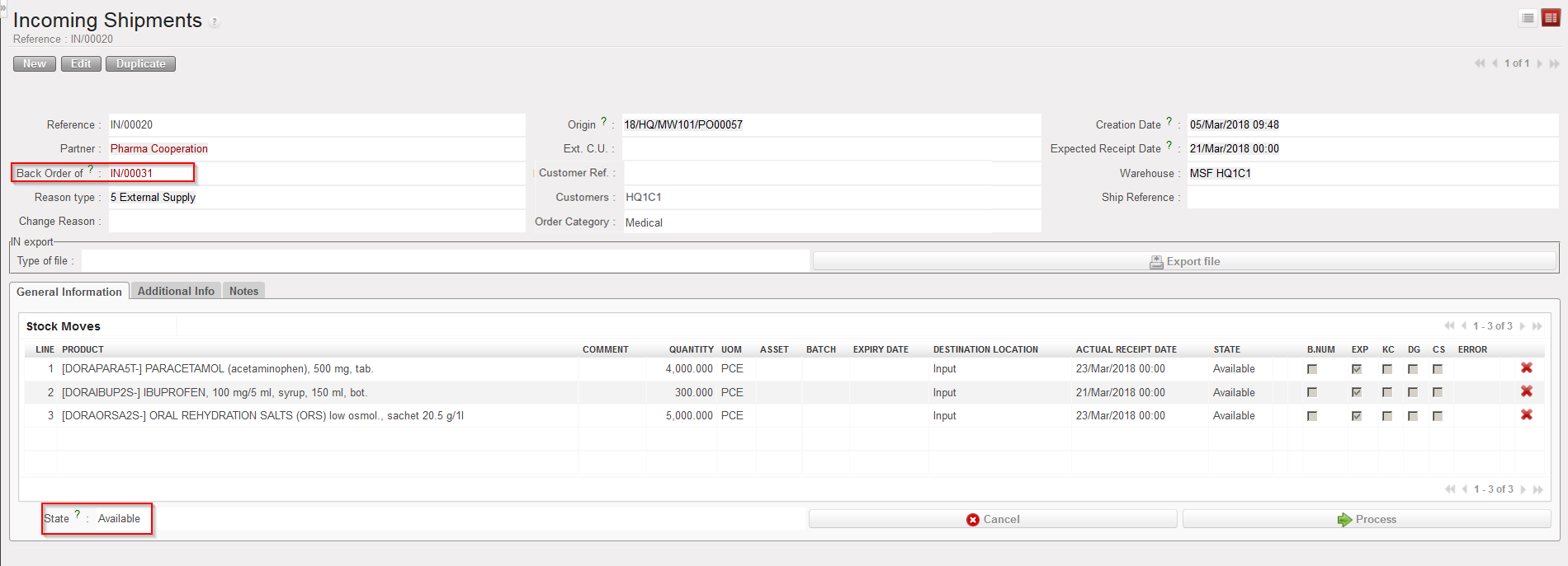 Incoming Shipments (INs) refer to all deliveries that you expect from a partner which can be internal (coordination or a project), external (a supplier), ESC (an MSF European Supply Centre), inter-mission (a coordination instance from your section) or inter-section (a coordination instance from another section). An Incoming Shipment is usually created automatically (in state “Available”) following the confirmation of a Purchase Order (or a PO-line in case of partial PO confirmation) in order to prepare the reception, even if goods could only be delivered by the supplier in some weeks/months. The initial Incoming Shipment document will have the same information (products, quantities, supplier, expected receipt date,…) as the corresponding confirmed PO (or PO-line).