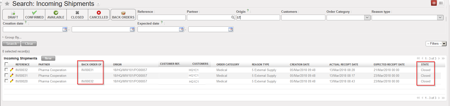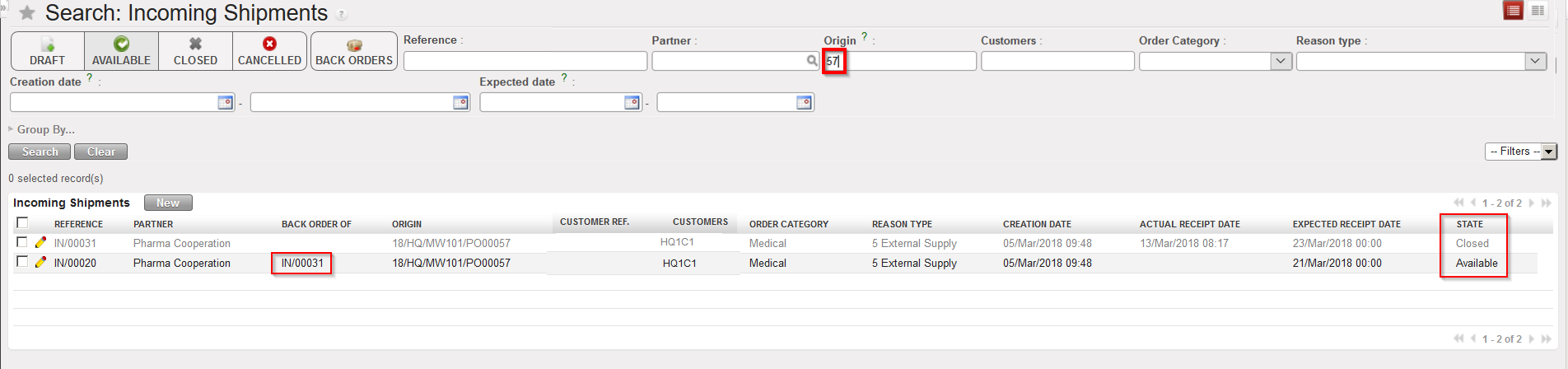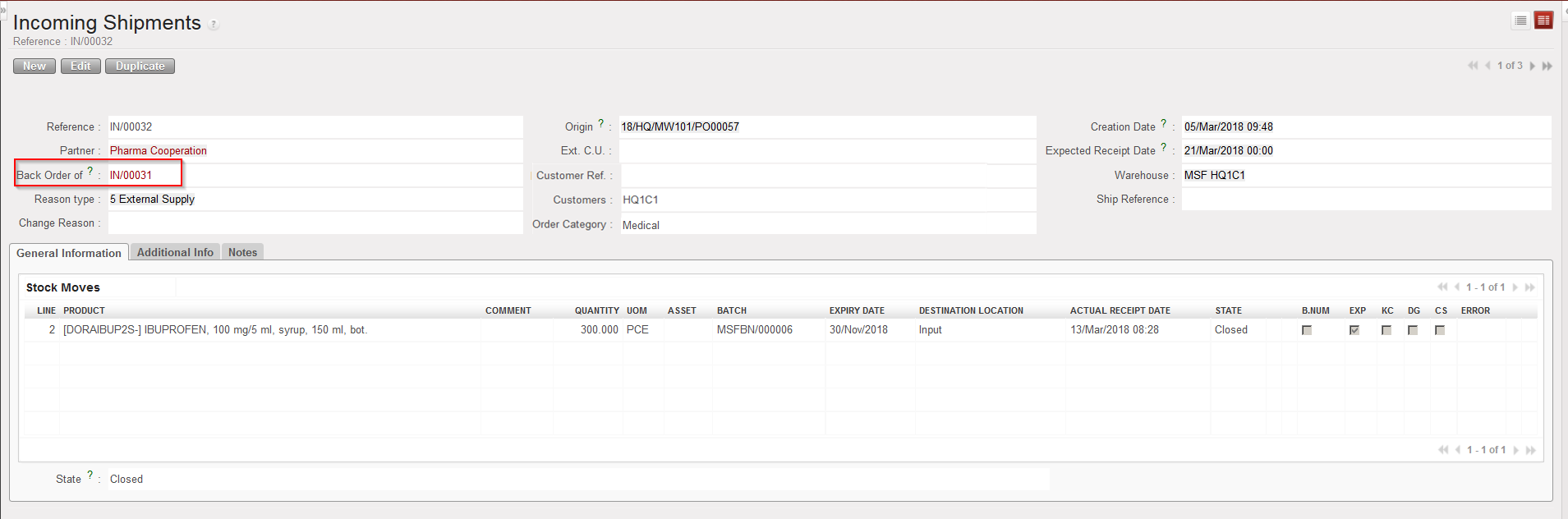 The field “Back order of” on the original IN shows the reference of the partial reception already processed. This information is also displayed on the “Search: Incoming Shipments” screen.