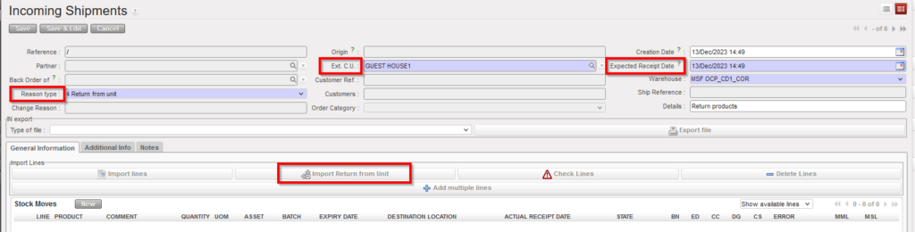 In case of the returns from external consumption units, there is a specific button for this import, and before the file can be imported, the header fields “Ext CU” and “Reason Type” and of course “Expected Receipt date” fields must be filled, Reason Type must be “Return from Unit”. The import file has a specific format, but the same checks are made as for the original import lines functionality. below screenshot showing the mandatory field to be filled and the bottom of Import Return from Unit.