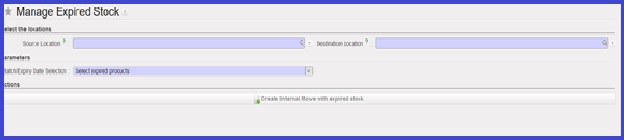 In the field “Expiring in the next” select the number of the weeks in the future, and then their will be 2 buttons, “View Expired/Expiring products” & “Create Internal Move with expired stock”