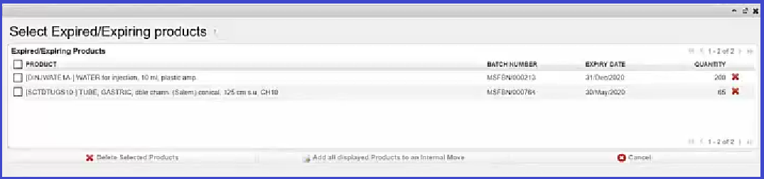 When the button “View Expired/Expiring products” is clicked , there is a pop-up window showing the possibility to review and choose the product to move before the creation of internal move “INT”