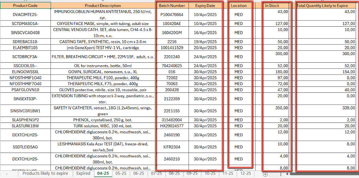 Note that the Excel Export will present several tabs: the first one will display the same information as on screen “Products likely to expire” with an overall view, while the other tabs will be displayed by expiration month (except for the already “Expired” tab) and provide more detailed information (Location, BN and ED…).